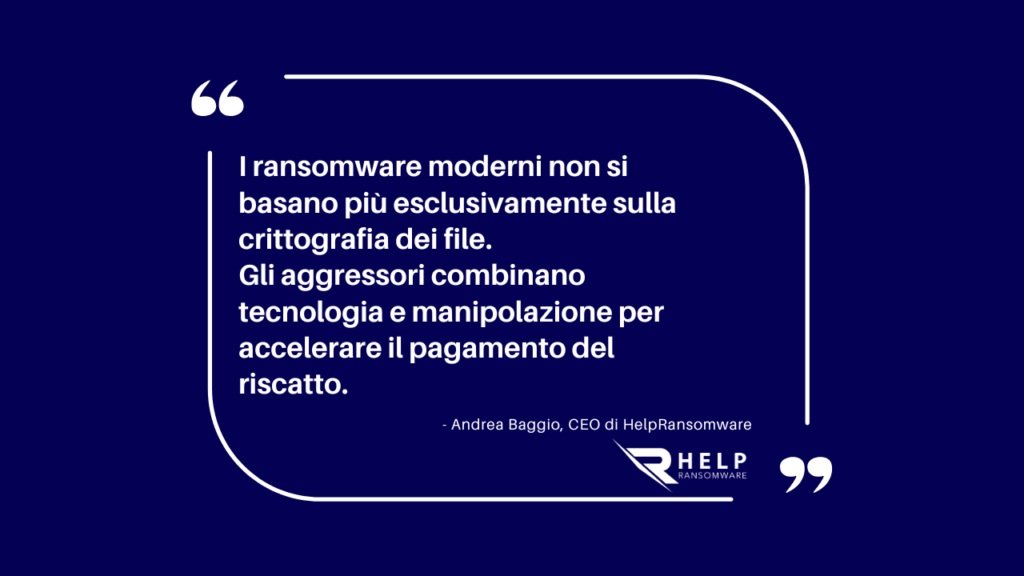 “Il ransomware moderno non si basa più soltanto sulla cifratura dei file. Gli attaccanti combinano tecnologia e manipolazione per accelerare il pagamento del riscatto.”